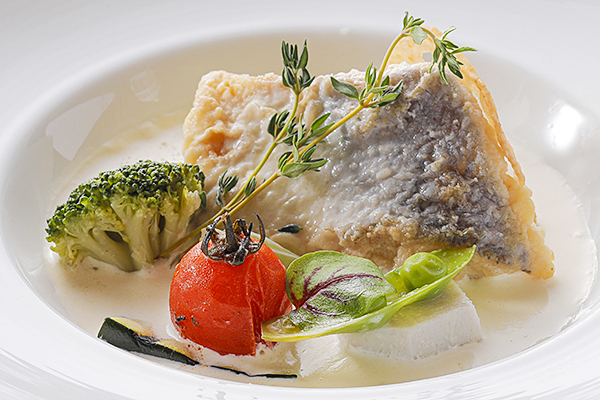 メルルーサと海老のポワレ バジル風味の白ワインソース